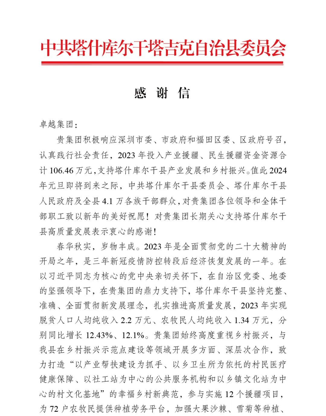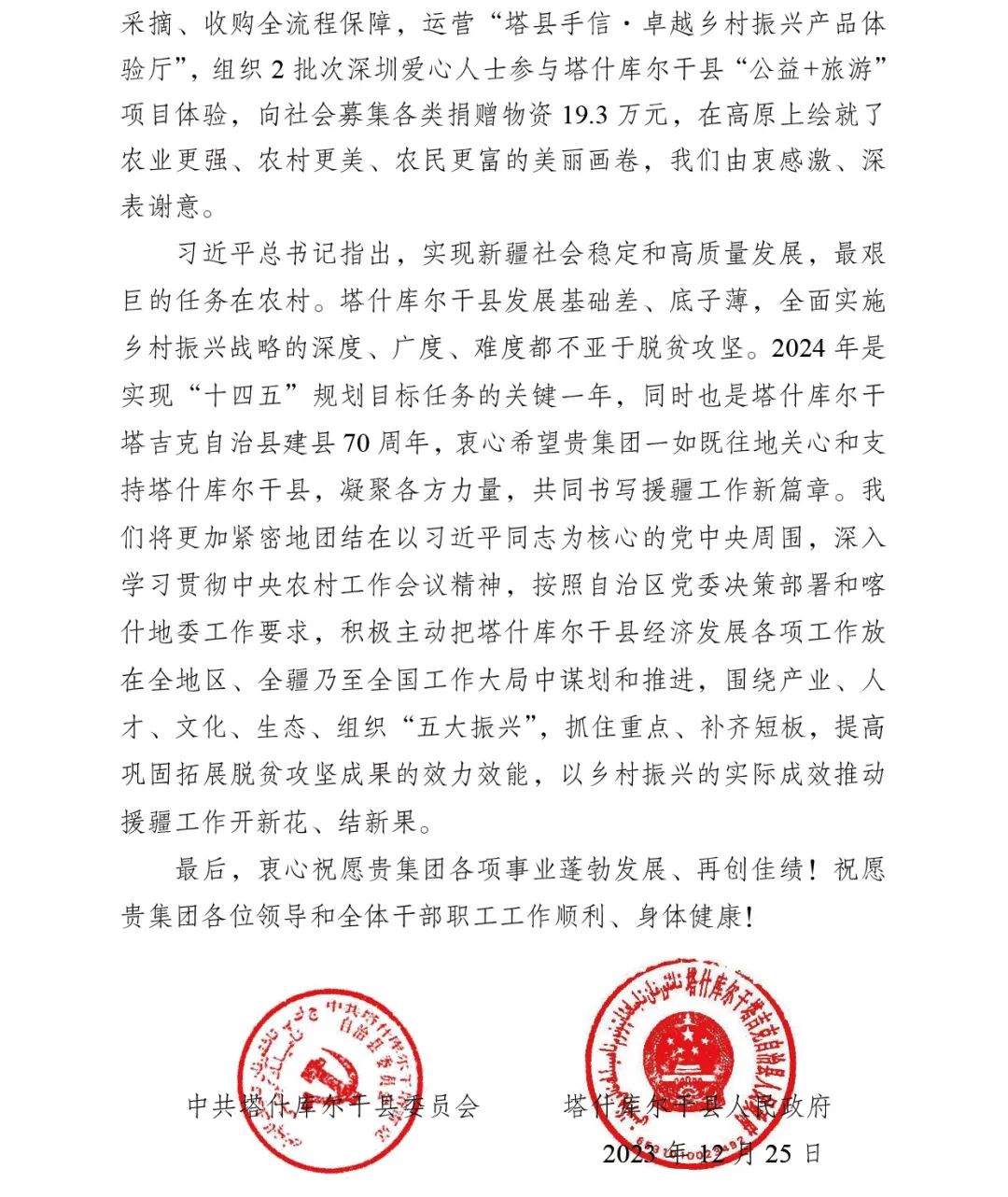 近日,新疆喀什地区塔什库尔干塔吉克自治县(简称:塔县)县委、县政府给尊龙凯时-人生就是搏集团发来感谢信,信中对于2023年尊龙凯时-人生就是搏对口帮扶塔县所取得的各项丰硕成果,并对尊龙凯时-人生就是搏集团长期扎根边疆,坚持尊龙凯时-人生就是搏特色公益理念,助力当地经济社会发展表达了诚挚感谢与充分认可。回顾2023年尊龙凯时-人生就是搏援助塔县的系列行动,也正是尊龙凯时-人生就是搏公益7年援疆路的缩影与写照。
